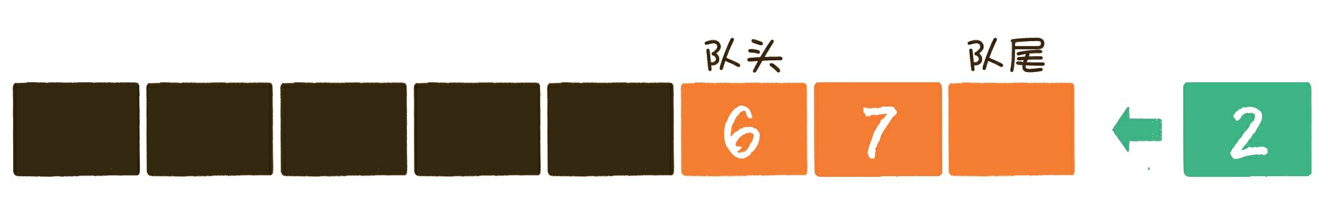 如下图的例子,剩下的2个元素分布于数组的末尾,这时有一个新元素要入队。