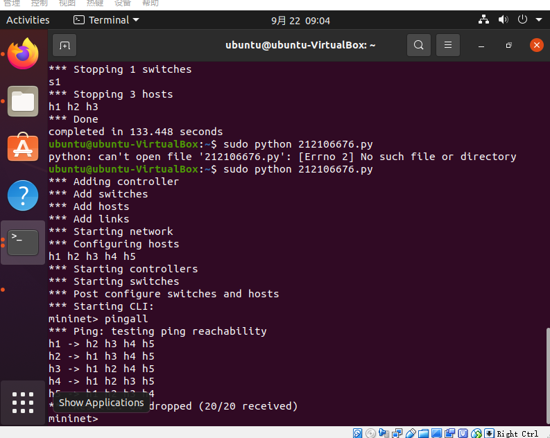 在2 b)的基础上,在Mininet交互界面上新增1台主机并且连接到交换机上,再测试新拓扑的连通性。