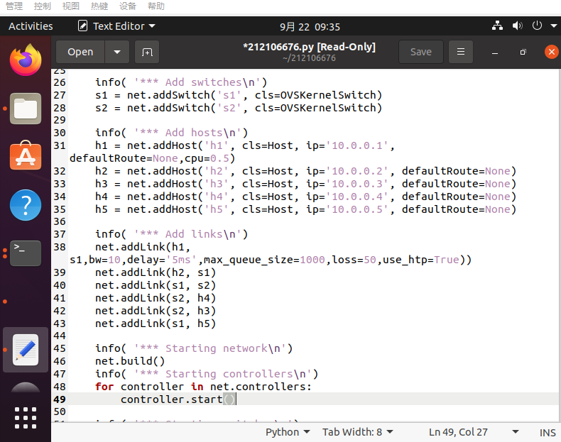 - 第一次接触SDN,由于没有代码的的基础,只能一边写一边记。不过好在有学过linux操作系统对于创建目录,移动文件夹这些简单的命令得心应手。对于其他长命令先理解意思再理解作用,再上手操作,遇到了文件重写的权限问题,先用sudo chmod +777 命令给文件修改权限,然后解决。