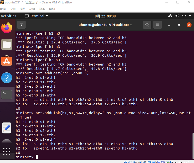 b) h1和s1之间的链路带宽为10,延迟为5ms,最大队列大小为1000,损耗率50。![]()