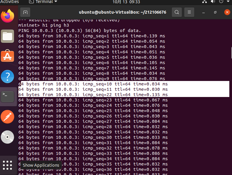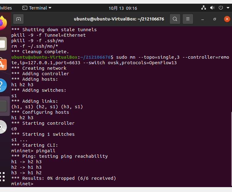 基础要求需要提交两张图,一是Mininet拓扑生成并连接控制器的结果,二是Mininet中ping测试截图,并体现个人信息,其余文字请勿赘述;
