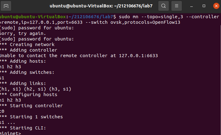 搭建拓扑 命令行输入sudo mn --topo=single,3 --controller=remote,ip=127.0.0.1,port=6633 --switch ovsk,protocols=OpenFlow13