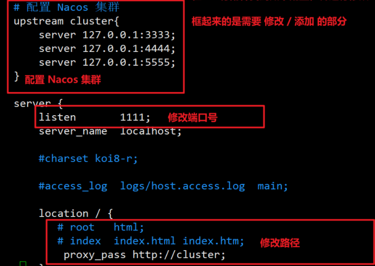 # 配置 Nacos 集群 upstream cluster{ server 127.0.0.1:3333; server 127.0.0.1:4444; server 127.0.0.1:5555; }