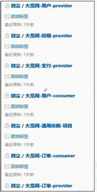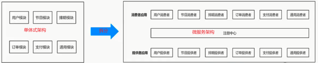 - 把项目拆分成多个功能的模块,模块之间都注册到注册中心再通过接口互相访问,即使某些模块挂掉也不会影响别的模块正常运行,这就是微服务架构。
