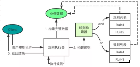 public class RuleServiceTest { @org.junit.Test public void execute() { //规则执行器 //优点:比较简单,每个规则可以独立,将规则,数据,执行器拆分出来,调用方比较规整 //缺点:数据依赖公共传输对象 dto //1. 定义规则 init rule AgeRule ageRule = new AgeRule(); NameRule nameRule = new NameRule(); NationalityRule nationalityRule = new NationalityRule(); AddressRule addressRule = new AddressRule(); SubjectRule subjectRule = new SubjectRule(); //2. 构造需要的数据 create dto RuleDto dto = new RuleDto(); dto.setAge(5); dto.setName("张三"); dto.setAddress("北京"); dto.setSubject("数学");; //3. 通过以链式调用构建和执行 rule execute boolean ruleResult = RuleService .create() .and(Arrays.asList(nationalityRule, nameRule, addressRule)) .or(Arrays.asList(ageRule, subjectRule)) .execute(dto); System.out.println("this student rule execute result :" + ruleResult); } }