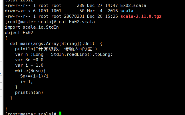 例如, 若 q 的值为 50.0 , 则输出应为: Sn=50.416695 。 请将源文件保存为exercise2-1.scala,在REPL 模式下测试运行,测试样例:q=1 时,Sn=2;q=30 时,Sn=30.891459; q=50 时,Sn=50.416695。