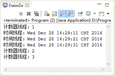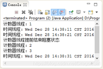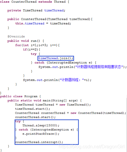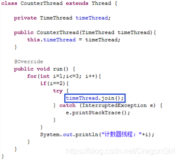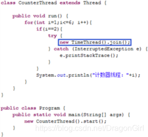 注:当循环执行到i为2时该行代码执行,CounterThread所创建线程进入阻塞状态,直到timeThread变量所对应线程结束, CounterThread所创建线程才能再次进入就绪状态,进而进入执行状态。