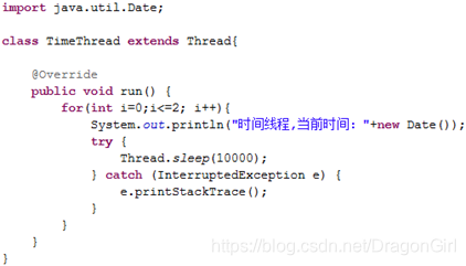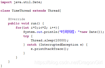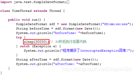 2.void sleep(long millis):Thread类静态方法,线程进入阻塞状态,在指定时间(单位为毫秒)到达之后进入就绪状态(Runnable),而非立即进入执行状态。