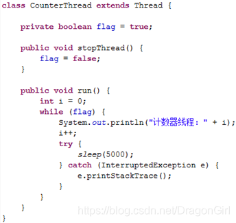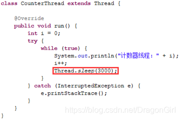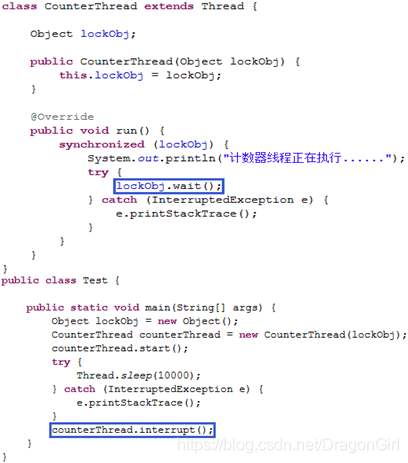 注:当线程执行该行代码后,线程进入阻塞状态;但由于10秒后主线程执行了“counterThread.interrupt();”代码使得该线程阻塞状态结束。该行代码的执行会结束counterThread线程的阻塞状态。