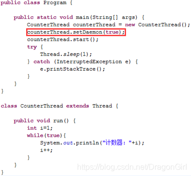 注:守护线程不是将原来线程改为守护线程,而是本来就是守护线程,别忘了setDaemon方法需要在start方法之前调用。设置本线程为守护线程。