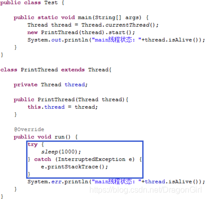 注:当打印线程阻塞时程序一定会先执行main方法中的输出语句,此时输出true;当打印线程阻塞状态结束,此时输出false,由此可见main方法中启动的线程可能晚于主线程结束。