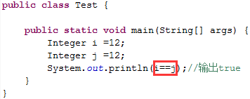 注:Java中的==有两种作用:如果是基本数据类型则用于判断其值是否相等;如果为引用类型则用于判断两者的地址是否相同。此处i和j均为引用类型,但因为其值都是12,所以i和j引用的是同一块地址,所以使用==判断时其结果为true。