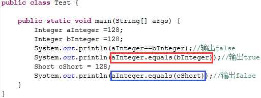 蓝框:aInteger和cShort的值都是128,但是由于两者数据类型不同,所以aInteger.equals(cShort)返回false