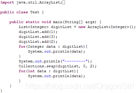 6.swap(List<?> list, int si, int j):在指定列表的指定位置处交换元素,如果指定位置相同,则调用此方法不会更改列表。
