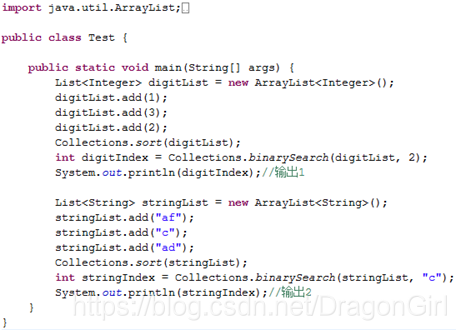 7.binarySearch(List<? extends Comparable<? super T>> list, T key) :返list集合元素按照自然顺序升序排序后,使用二分搜索法搜索list集合,返回指定对象的索引,如果没找到返回-1。