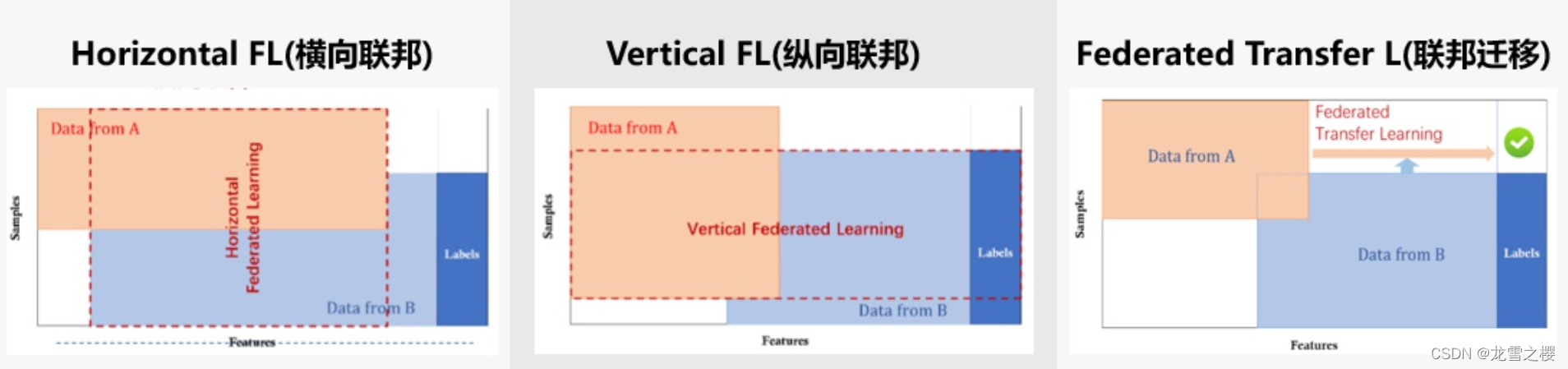联邦学习分为横向联邦、纵向联邦和迁移联邦,之间的区分主要是样本与特征的重叠程度。不同数据集往往有两个特点之分,一是数量,对应样本,二是具体分布,也就是特征。