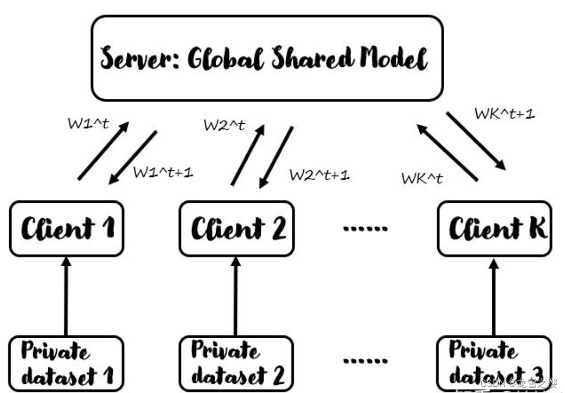 其结构由Server和若干Client组成,在联邦学习方法过程中,没有任何用户数据被传送到Server端,这保护了用户数据的隐私。此外,通信中传输的参数是特定于改进当前模型的,因此一旦应用了它们,Server就没有理由存储它们,这进一步提高了安全性。
