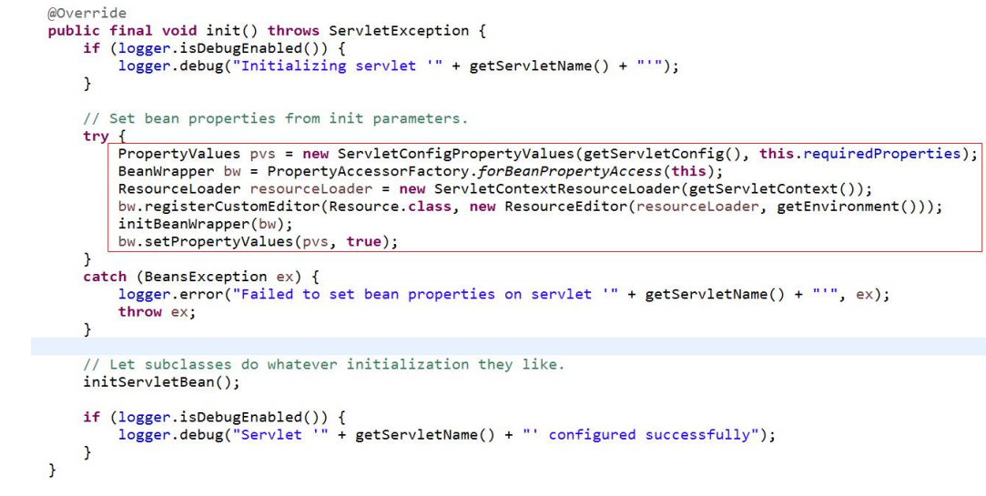 HttpServletBean 覆写了 init 方法,主要做一些初始化的工作,将 web.xml 中配置的参数设置到 Servlet 中。比如 servlet 标签的子标签 init-param 标签中配置的参数