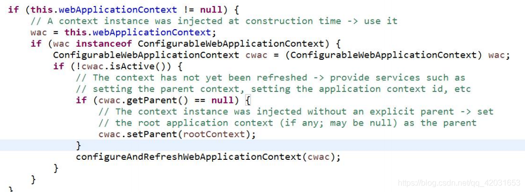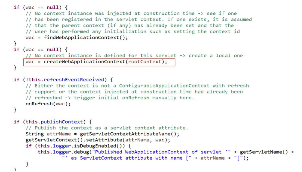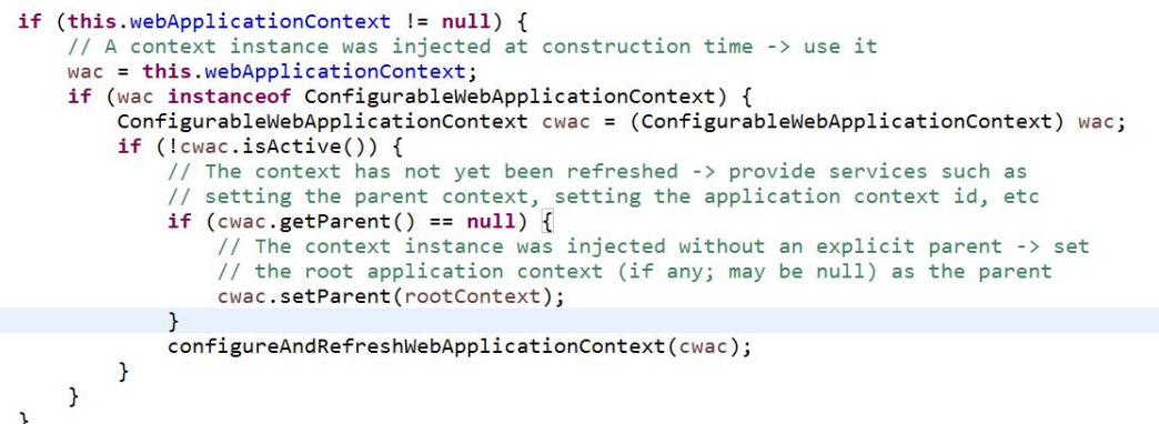 可以看到,最重要的就是 this.webApplicationContext = initWebApplicationContext();这段代码,这个方法的作用是创建或刷新 WebApplicationContext 实例。如果项目中使用到了 spring,则进行父子容器关联。