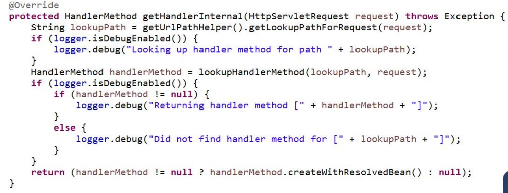 上 述 代 码 中 lookupHandlerMethod() 方 法 主 要 工 作 是 在 Map<T, HandlerMethod> handlerMethods 中找到 HandlerMethod,这里的 T 是 HandlerMappingInfo,它封装了@RequestMapping 注解中的信息。