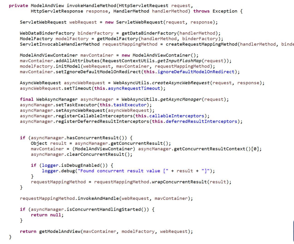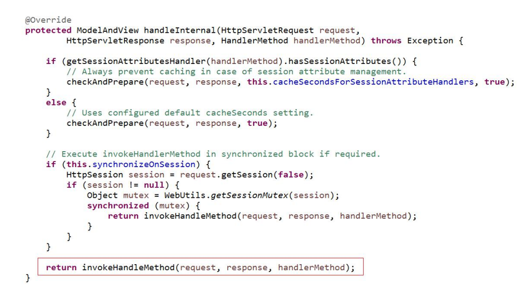 在 handlerInternal 方法中通过调用 invokeHandleMethod 方法执行 HandlerMethod 并返回一个 ModelAndView。