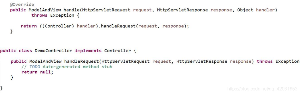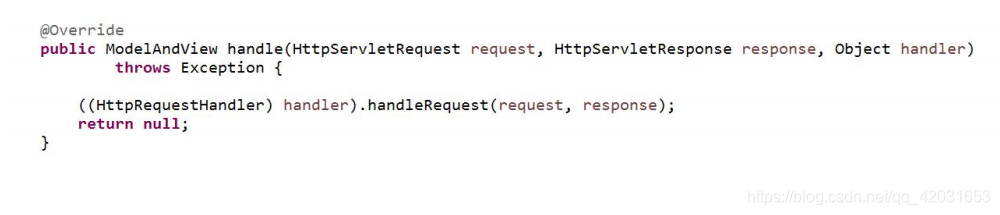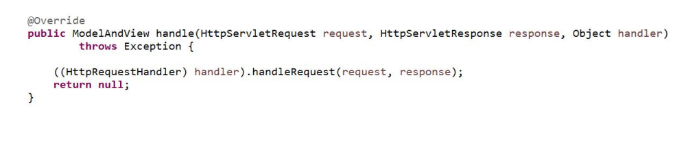 boolean supports(Object handler); 判断是否支持传入的 HandlerModelAndView handle(HttpServletRequest request, HttpServletResponse response, Object handler) 用来使用 Handler 处理请求