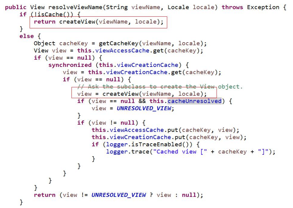 AbstractCachingViewResolver 是带有缓存的 ViewResolver,它每次解析时先从缓存里查找,如果找到视图就返回,没有就创建新的视图,且创建新视图的方法由其子类实现。
