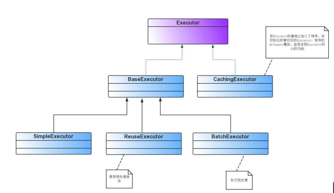 CachingExecutor:先从缓存中获取查询结果,存在就返回,不存在,再委托给 Executor delegate 去数据库取,delegate 可以是上面任一的 SimpleExecutor、ReuseExecutor、BatchExecutor。