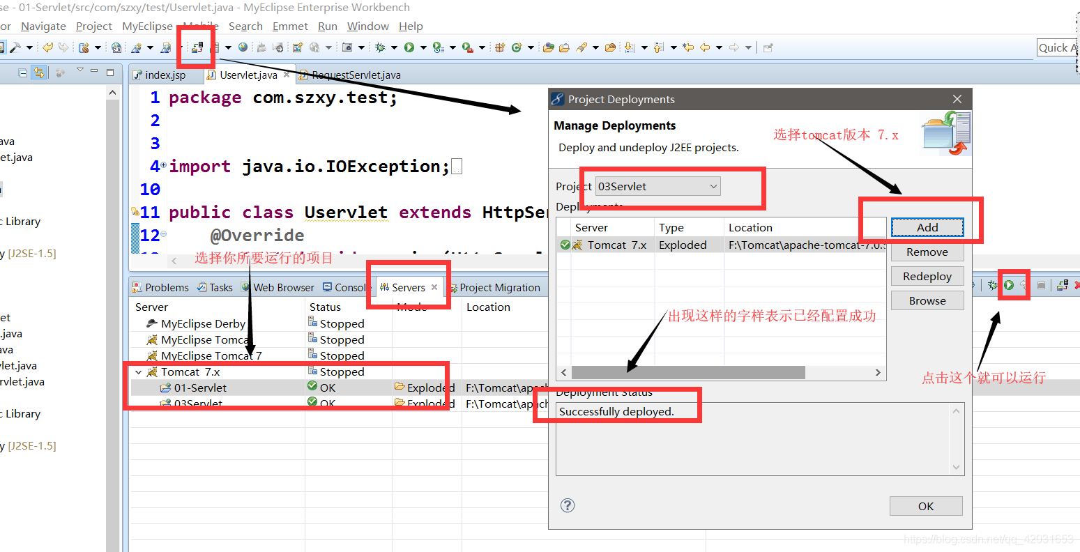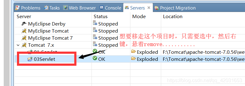 这样配置好之后,我们再去创建类时,就不要去创建class直接创建servlet,myecplise会自动帮我们生成web.xml文件。而且我们还只需要在myecplise中打开服务器即可: