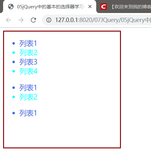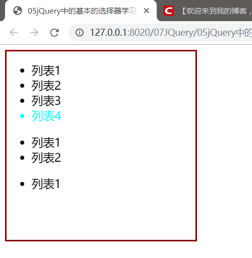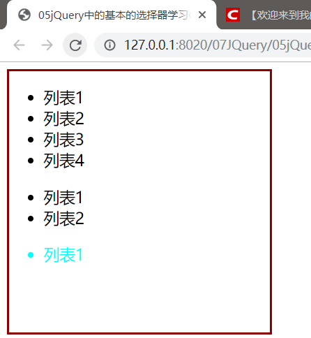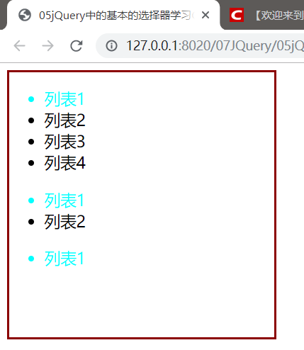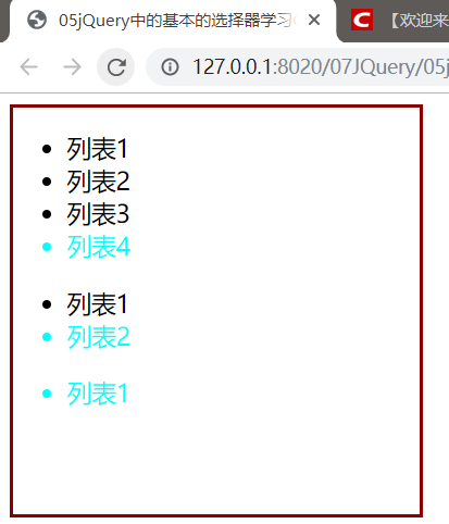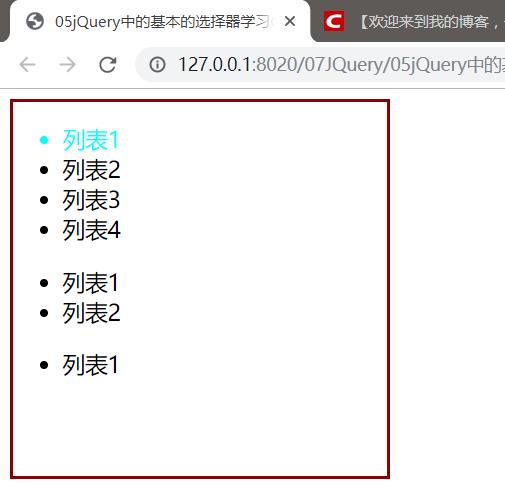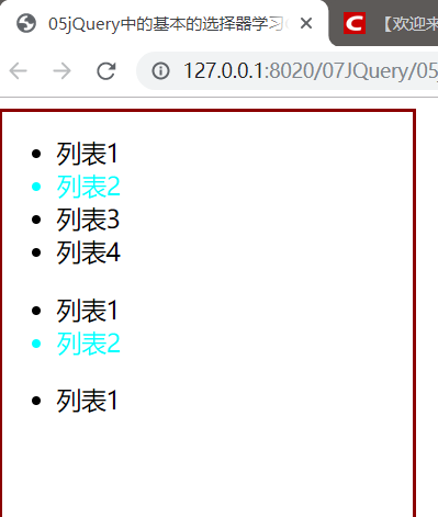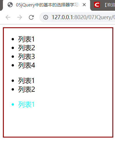 $("ul li:first-child").css("color","aqua");将所有列表的第一个元素变色