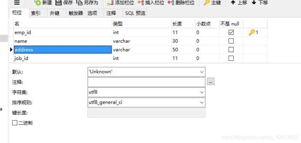 例:创建 emp3 表,该表包含 emp_id 主键且自动增长,包含 name,包含 address 该列默认 值为”未知”。