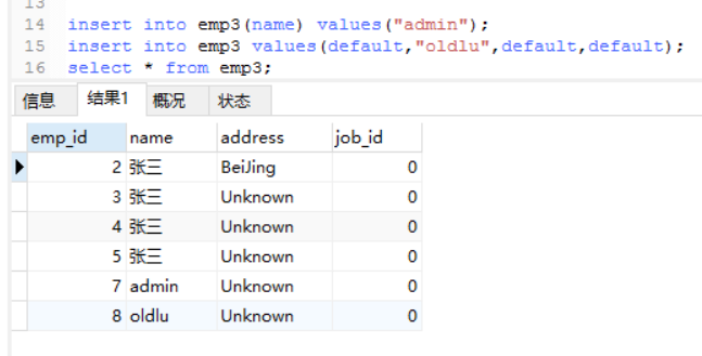 insert into emp3(name) values("admin"); insert into emp3 values(default,"oldlu",default,default);