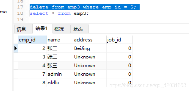 例:删除 emp3 表中 emp_id 为 5 的雇员信息。