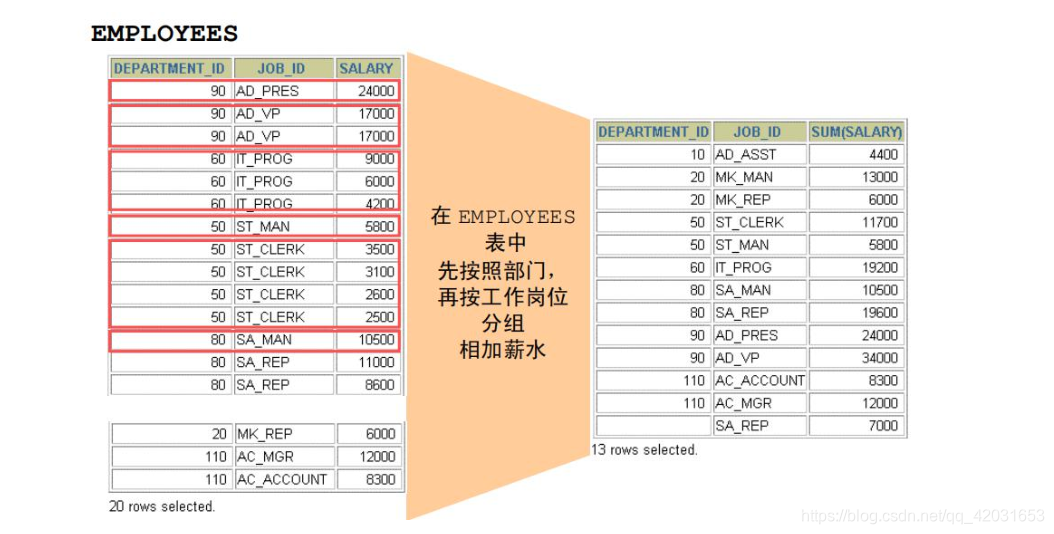 GROUP BY 子句:GROUP BY 子句可以把表中的行划分为组。然后可以用组函数返回每一组的摘要信息