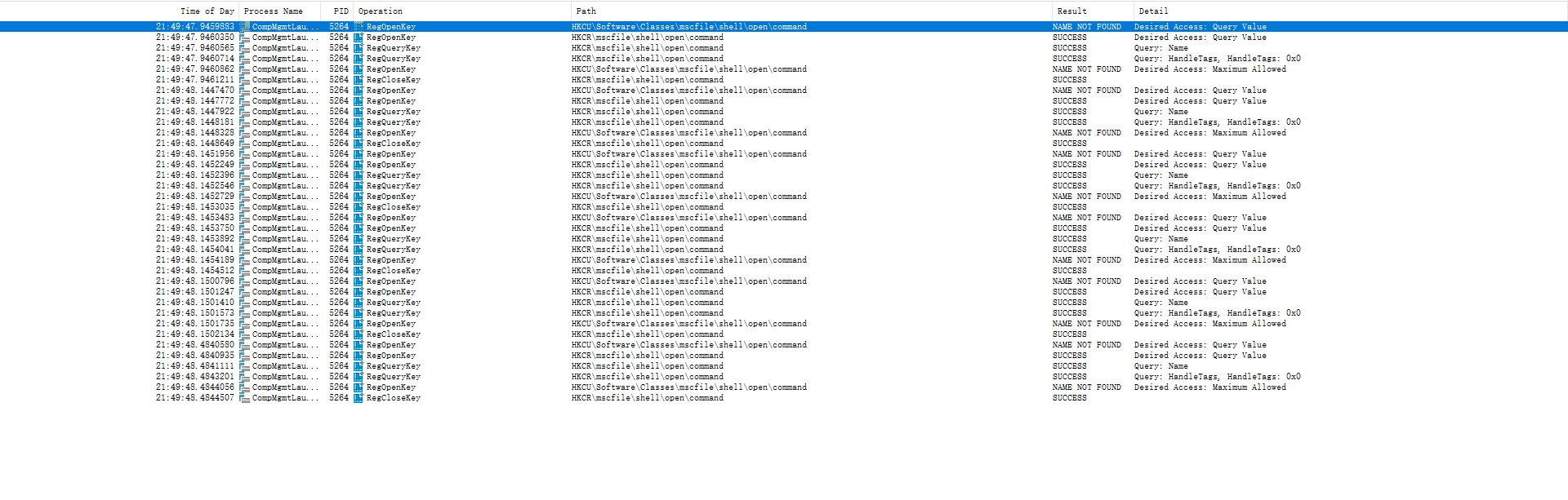 分析发现,CompMgmtLauncher.exe进程会先查询注册表HKCU\Software\Classes\mscfile\shell\open\command中的数据,发现该路路径不存在后,继续查询注册表HKCR\mscfile\shell\open\command(Default)中的数据并读取,该注册表路径中存储着mmc.exe进程的路径信息。