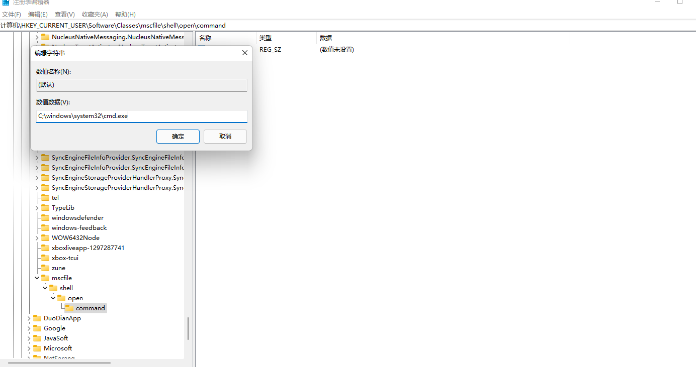 所以我们可以在HKCU\Software\Classes\mscfile\shell\open\command中写入数据。可以手动添加该注册表路径,并设置默认数据为C:\Windows\System32\cmd.exe,并运行CompMgmtLauncher.exe。