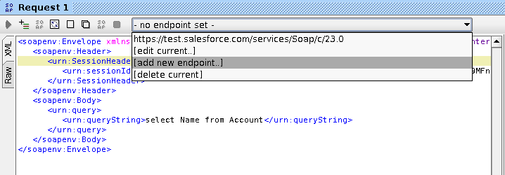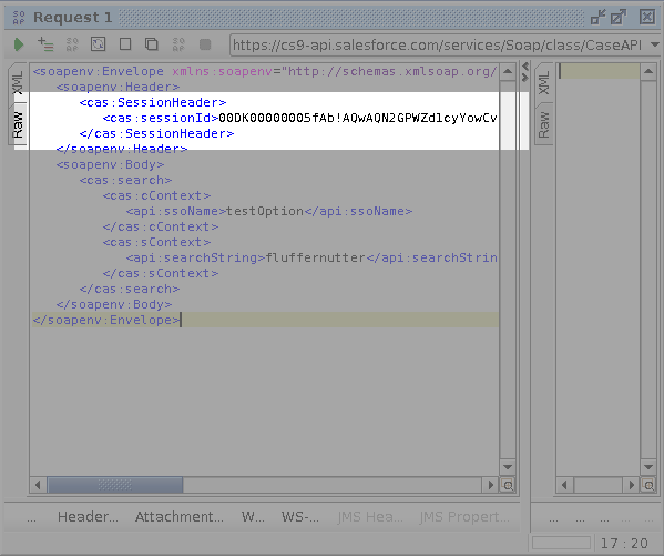 在下面的例子中,我们利用自动生成的模板来请求Query接口,同样,我们可以删除几乎所有的头部字段,只需要留下唯一部分就是SessionHeader 和Session Id。