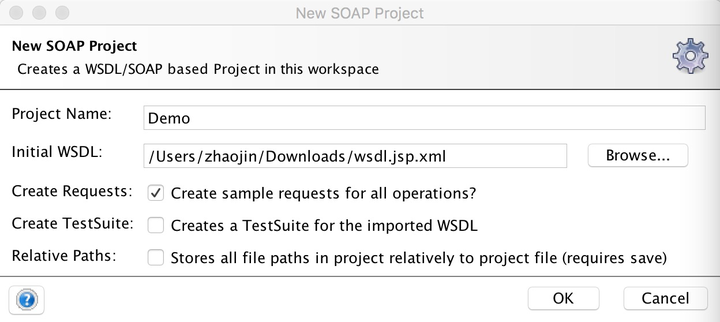 右键单击项目 ,并选择新的soapUI项目 并填写您的信息的形式,INTIAL WSDL应该选择刚刚保存的Partner WSDL。