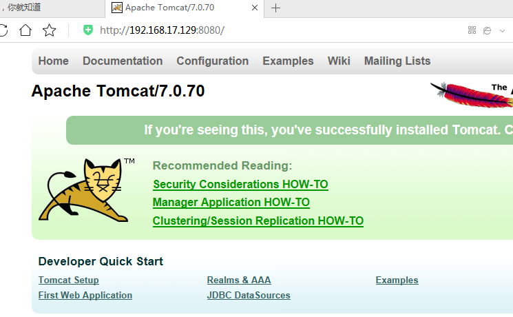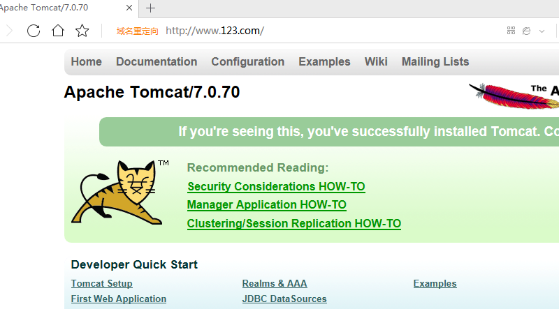 ( 1 )打开浏览器,在浏览器地址栏输入地址 http://www.123.com ,跳转到liunx系统tomcat主页