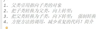 这里父类转换为子类需要强制转换(不推荐)子类转父类不需要(直接Father father = son;即可),但是会丢失一些自己是子类时的方法。