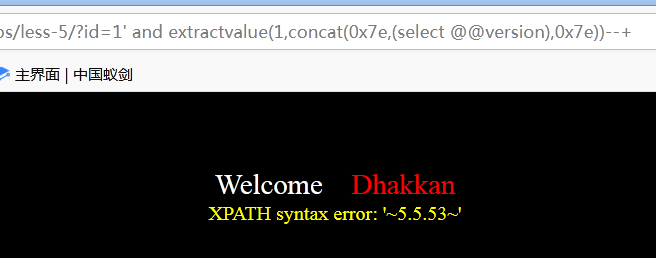 使用语句 1' and extractvalue(1,concat(0x7e,(select @@version),0x7e))--+ 。 其中concat是拼接()内的参数,0x7e解码之后为~符号。--+为注释符,将源代码中之后的语句全部注释掉以免发生错误。测试之后结果如下: