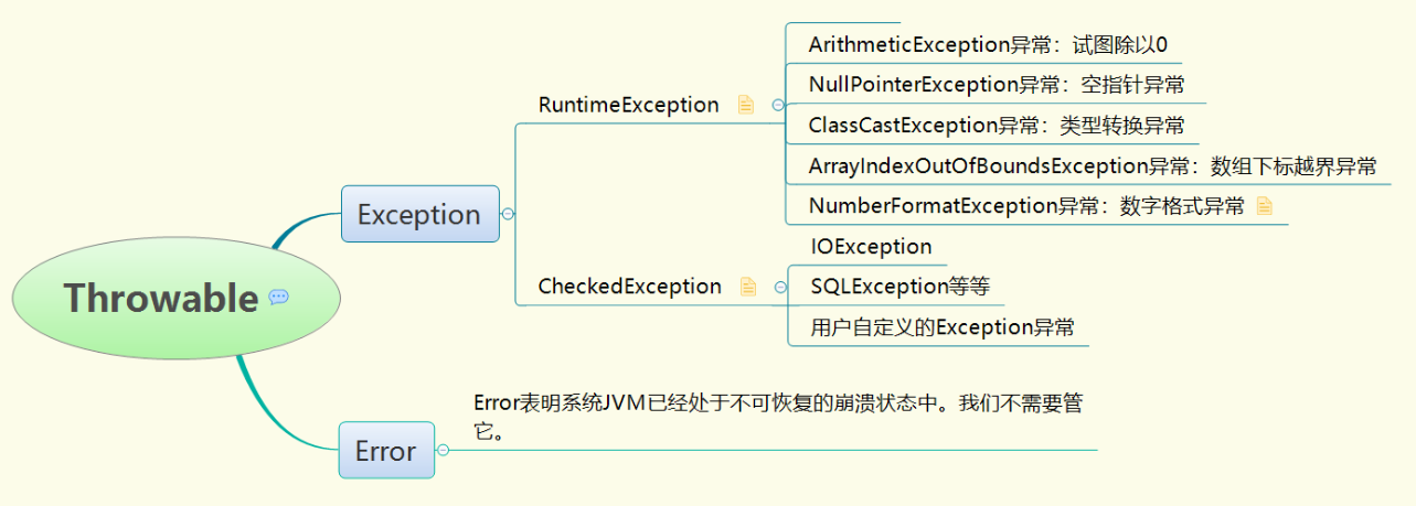 其他常见异常: IndexOutOfBoundsException 数组、字符串、向量排序索引超出范围异常 FileNotFoundException 文件未找到 空文件异常:所操作的文件不存在 NoSuchMethodException 方法不存在异常:无法找到某一特定方法 InsexOutBoundException 索引越界异常 ClassNotFoundException 类找不到异常 InputFormatException 输入类型不匹配异常 DateFormatException 日期格式转换异常 IllegalArgumentException 非法参数异常 NesativeArraySizeException 创建大小为负的数组异常 SecuurityException 安全异常:由安全管理器抛出的异常,只存在安全侵犯 PrintException 打印异常 ParseException 解析异常,日期字符串转换为日期对象的时候,有可能抛出的异常 OutOfMemoryError 内存不足 异常有编译期异常和运行时异常: 文件找不到的异常是编译期异常,需要主动捕获一下(try/catch) ClassNotFoundException 类空指针异常就是编译期异常,不需要手动捕获