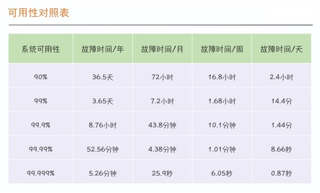 时间维度 :Availability = Uptime / (Uptime + Downtime)