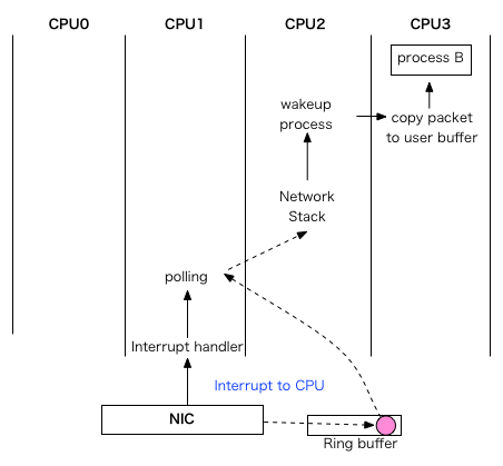 Without RFS, packet may across three different CPUs to deliver packet to a process, on worst case: