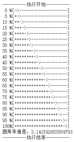 def PI(n): pi=0 for k in range(n): pi += 1/pow(16,k)*(4/(8*k+1)-2/(8*k+4)-1/(8*k+5)-1/(8*k+6)) return pi import time scale = 20 print("执行开始".center(scale+4,'-')) for i in range(scale+1): a='+' * i b='-' * (scale-i) c=(i/scale)*100 pi = PI(1000) print("{:^3.0f}%[{}->{}]".format(c,a,b)) time.sleep(0.1) print("由此方法计算的圆周率值是:{}".format(pi)) print("执行结束".center(scale+4,'-'))