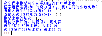 print("选手A获胜{}场比赛,占比{:0.1%}".format(winsA, winsA/n))